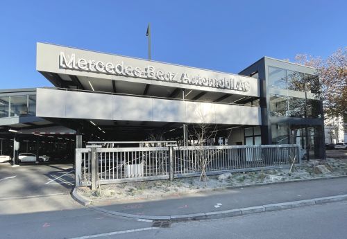 Die Zweigniederlassung Zürich-Nord der Mercedes Benz AG benötigte mehr Platz für ihre Neuwagen. Aufgrund der Erweiterung der Modellreihen durch neue Elektrofahrzeuge planten wir in einer Arbeitsgemeinschaft auf dem bestehenden Areal ein zweigeschossiges Parkdeck für 300 Fahrzeuge sowie zwei Erschliessungstrakte, welche zusätzlich als Auto-Schaufenster funktionieren. Gleichzeitig wird auf dem Areal auch das Landschaftskonzept des übergeordneten "inneren Garten" umgesetzt, um dem versiegelten Areal wertvolle Grünfläche zurück zu geben. Seit unserer ersten Projektierung im Jahr 2007 wurde das Projekt wegen der Finanzkrise, der Pandemie sowie der Energiekriese gleich mehrfach unterbrochen. Von August 2023 bis September 2024 ist das Bauvorhaben nun fertig erstellt worden.