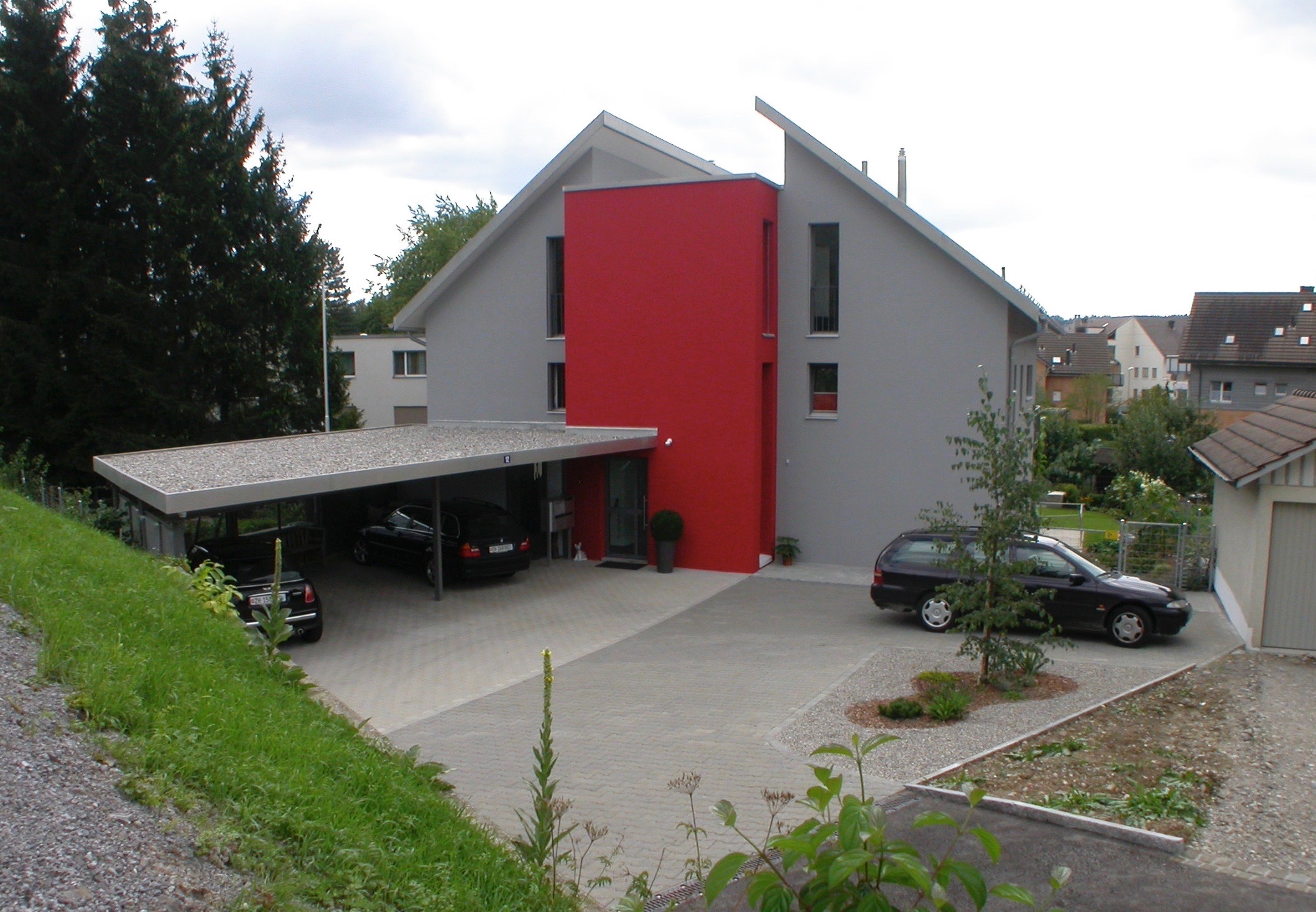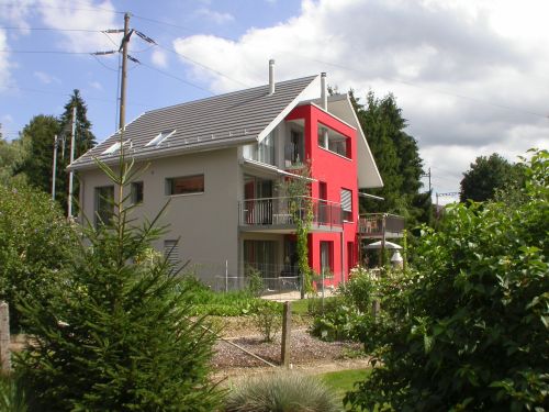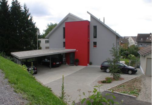 Für eine Familie mit zwei erwachsenen Töchtern projektierten wir ein Zweigenerationen-Haus mit einer Gartenwohnung sowie zwei Maisonette-Wohnungshälften. Das Hauptmerkmal unseres Entwurfs ist die Pultdachform mit tieferliegendem Zwischentrakt. Diese Form wählten wir, um in den Dachgeschossen gleichermassen Morgen- und Abendsonne zu gewährleisten. Gleichzeitig kann die Wohnungsaufteilung aufgrund des Gebäudevolumens von Aussen abgelesen werden.